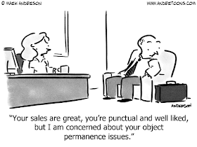 Well, maybe I failed that developmental milestone. I'm just not very sophisticated with my sense of object permanence. If my partner doesn't reach out, then I think he is losing interest.